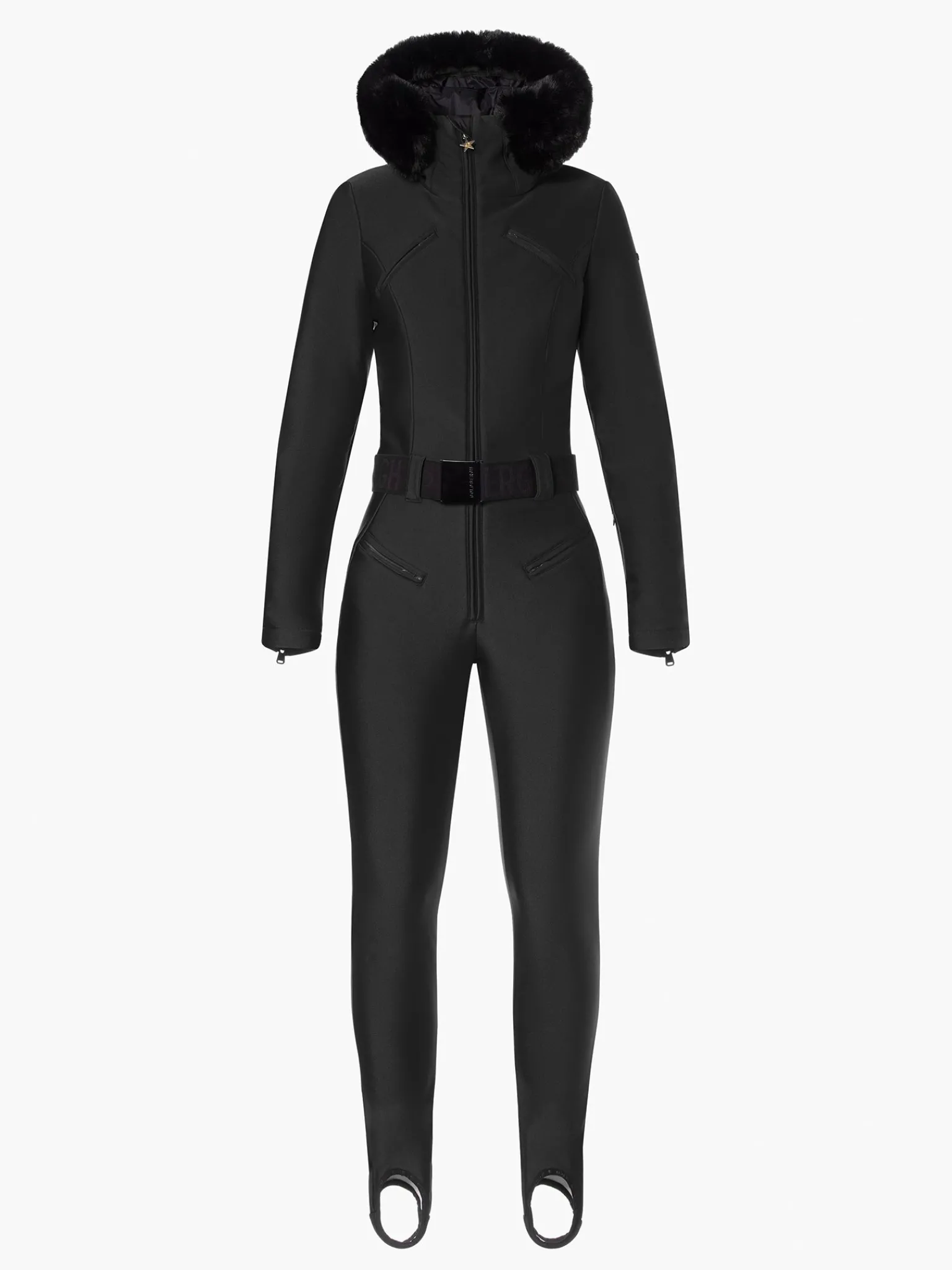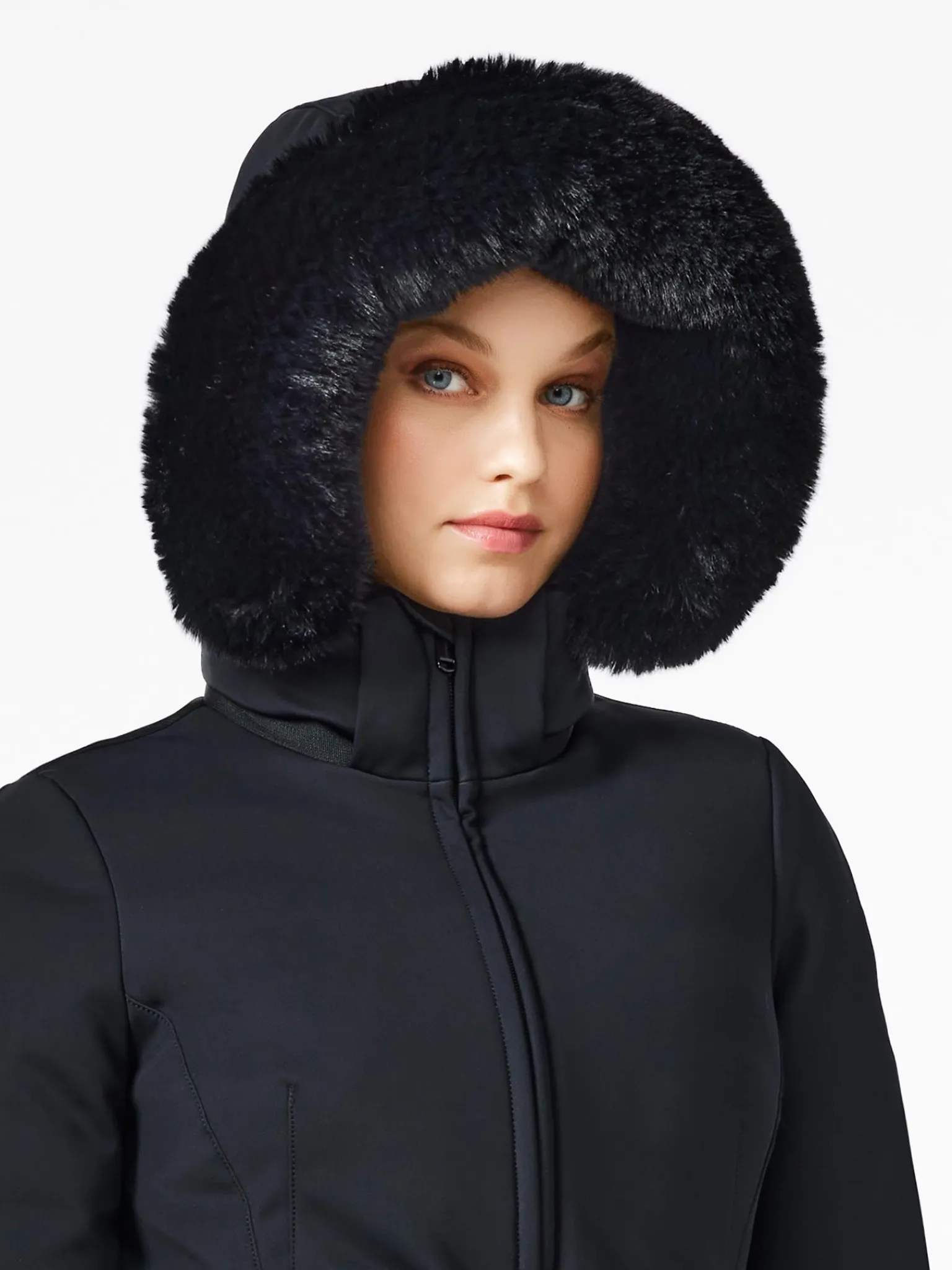 Softshell glanzende skioverall met capuchon, losse sneeuwvangers en faux fur rand
