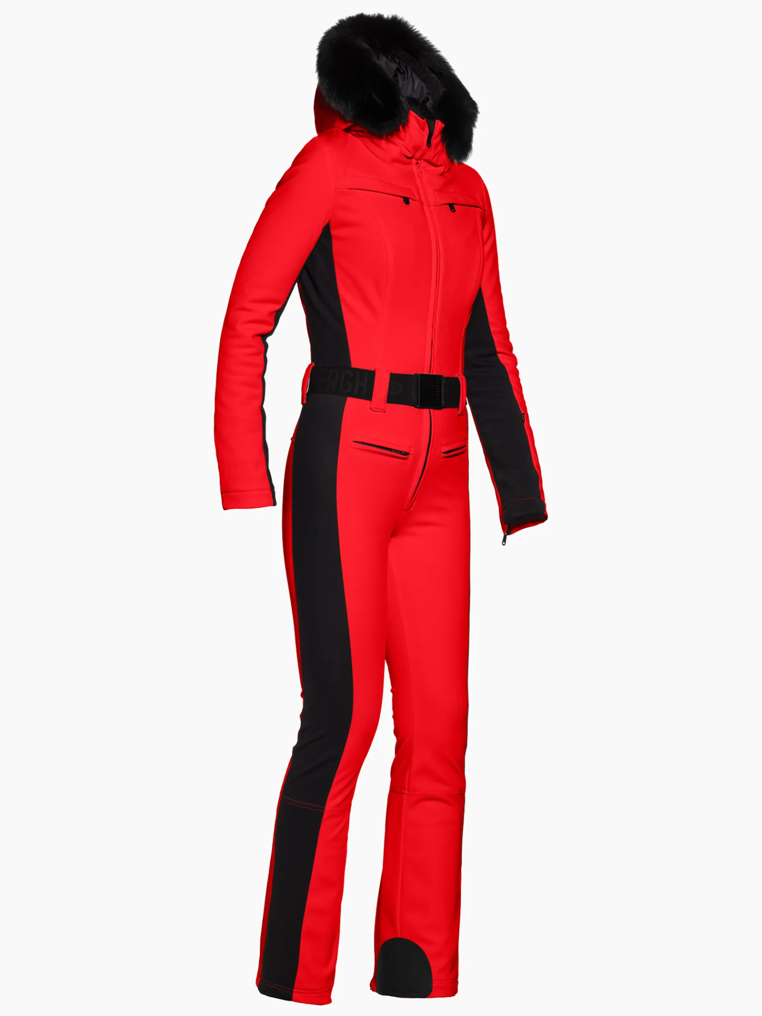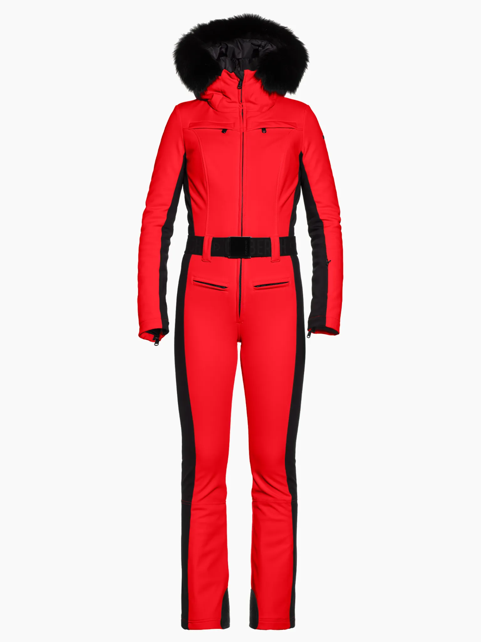 Softshell skipak met capuchon, extra beenlengte en imitatiebont rand